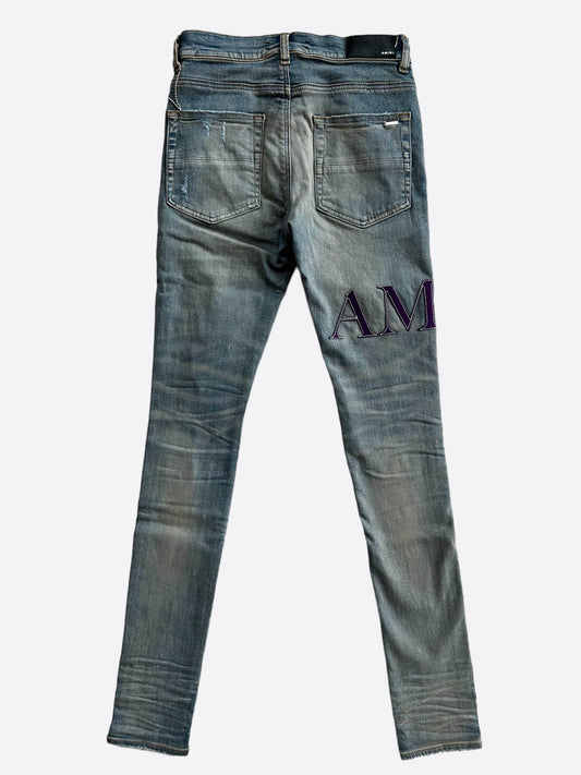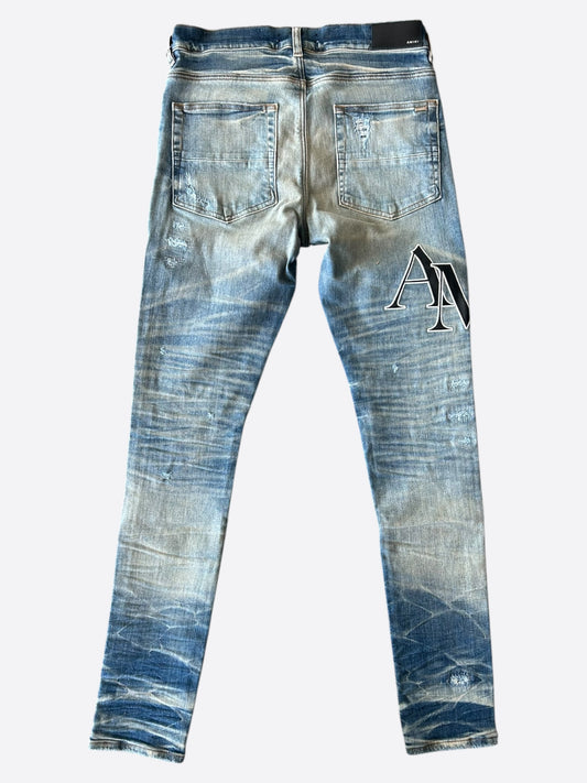 Amiri Clay Indigo Serif Logo Distressed Jeans