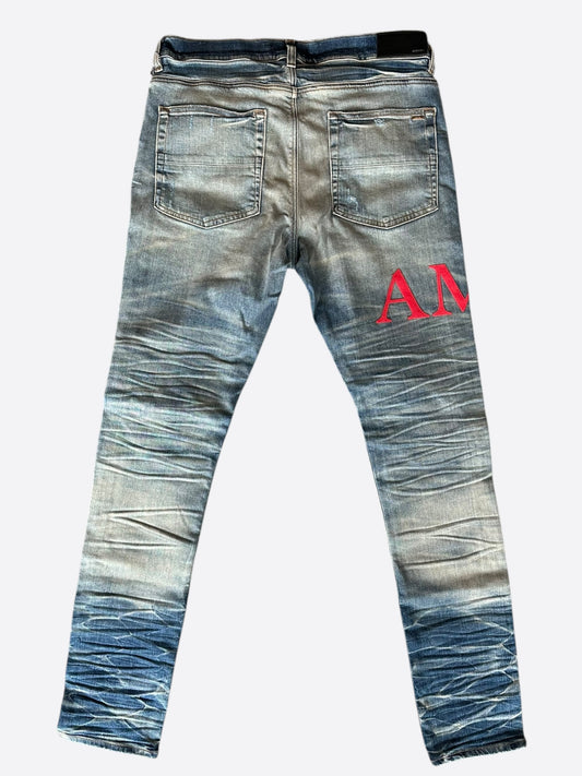 Amiri Vintage Indigo Red Serif Logo Distressed Jeans