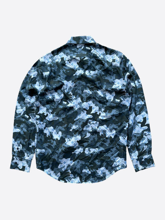 Louis Vuitton Blue Camouflage Monogram Silk Button Up Shirt